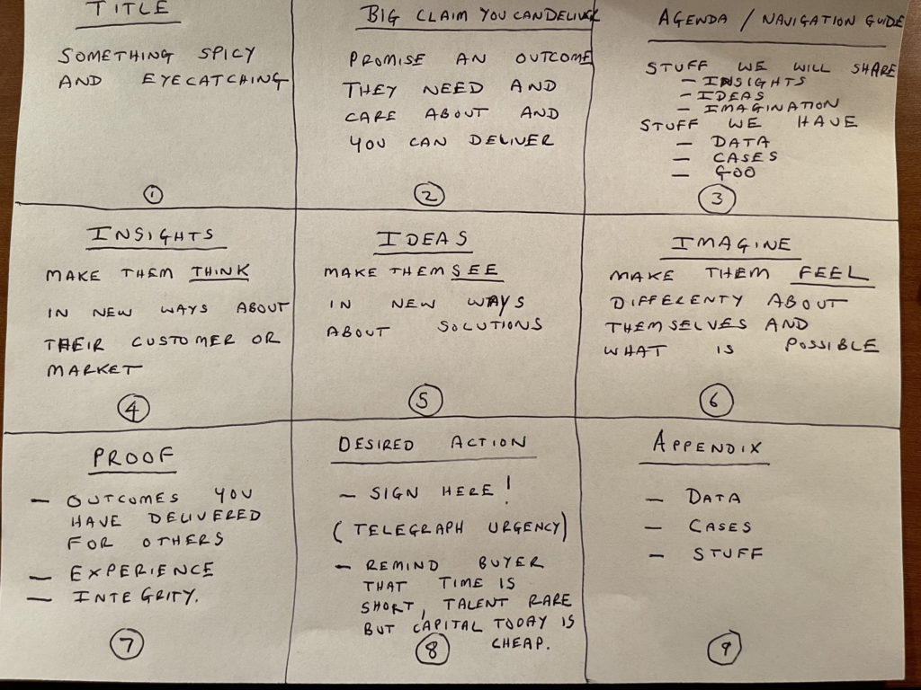 Then the focus of your work is slide 4, 5 and 6 which you may want to label Insights, Ideas, Imagination. What insights about customer, consumer, marketplace, competition will you be sharing that get your audience to THINK differently? What one two or three big ideas are you delivering that will make their customers or consumers SEE them differently? What provocations, perspectives, points of view are you communicating that will get your audience to FEEL differently about their business, their future or you?