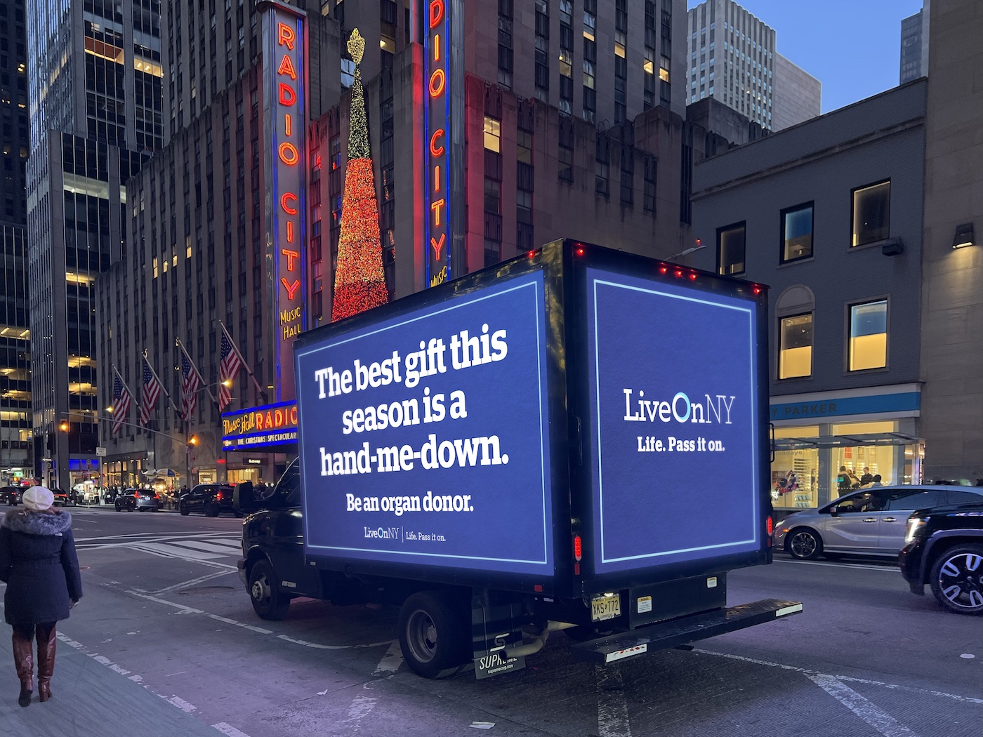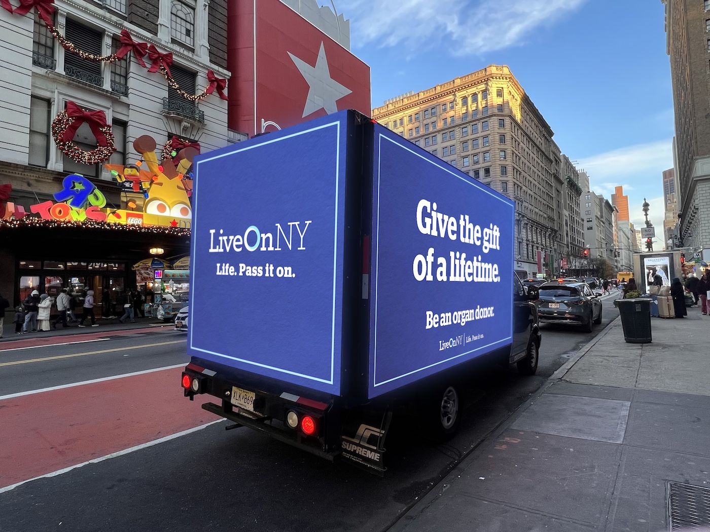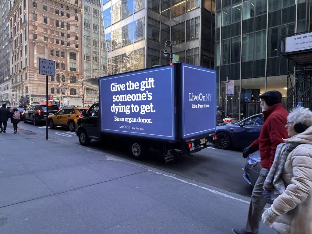 Today though Monday, mobile vans will circle Herald Square and loop around Madison and Fifth avenues in Midtown with messages to the gift-giving masses from LiveOnNY, the organ procurement organization for the NYC metro area.