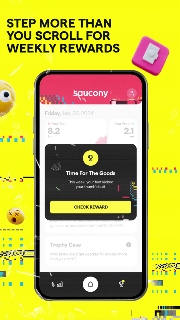 When a person moves further than they scroll, rewards in the form of exclusive Saucony branded merchandise become available.