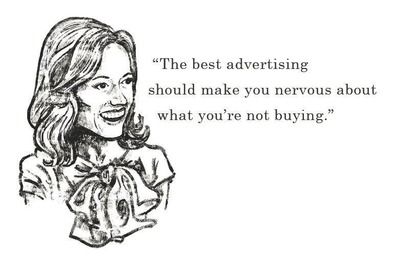 I think today’s ad makers can learn to appreciate her ambition and drive. Her need to love the product is also hugely instructive. When a brand blows smoke, the ads stink. And a brand will blow smoke when the people who make their ads care more about their next trip to Cannes than they do about seeing the client succeed.
