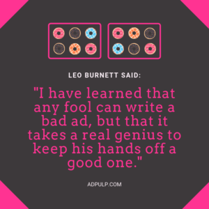 Speaking of arrivals, Chicago in 1935 was not the perfect place for a future Ad Legend to be. Or so said a Windy City journalist at the time. “It won’t be long ’til Leo Burnett is selling apples on the street corner instead of giving them away,” the man wrote. Journos can be such windbags sometimes.