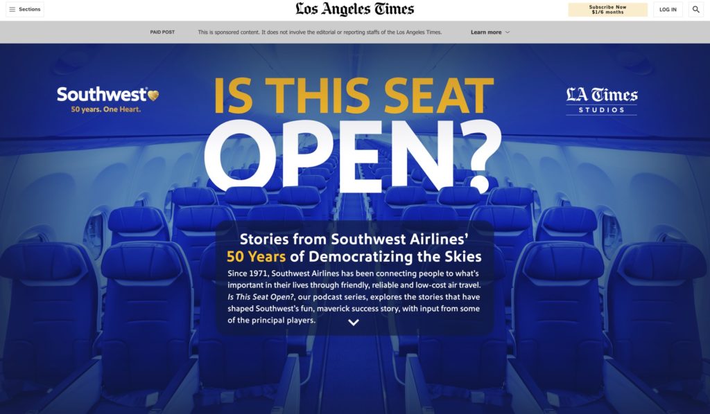 “Is This Seat Open?,” is a new podcast produced by L.A. Times Studios and At Will Media in partnership with Southwest Airlines. In celebration of Southwest’s 50th anniversary, the 20-episode audio series features first-hand stories from the people who lived through the wildest and most memorable moments in the airline’s history.
