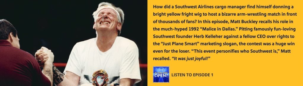 Hosted by Southwest employees Quinnie Jenkins and Lucas Hershberger, each 7 to10-minute episode features someone from the company. I like the short format and the first episode, “Malice in Dallas” is spot on. At the core of the story is an epic battle between two CEOs over an advertising tagline.