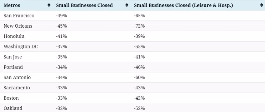Here’s how cities around the country are doing, sorted by the percentage of small businesses (in leisure and hospitality) that are closed as of September 2020: