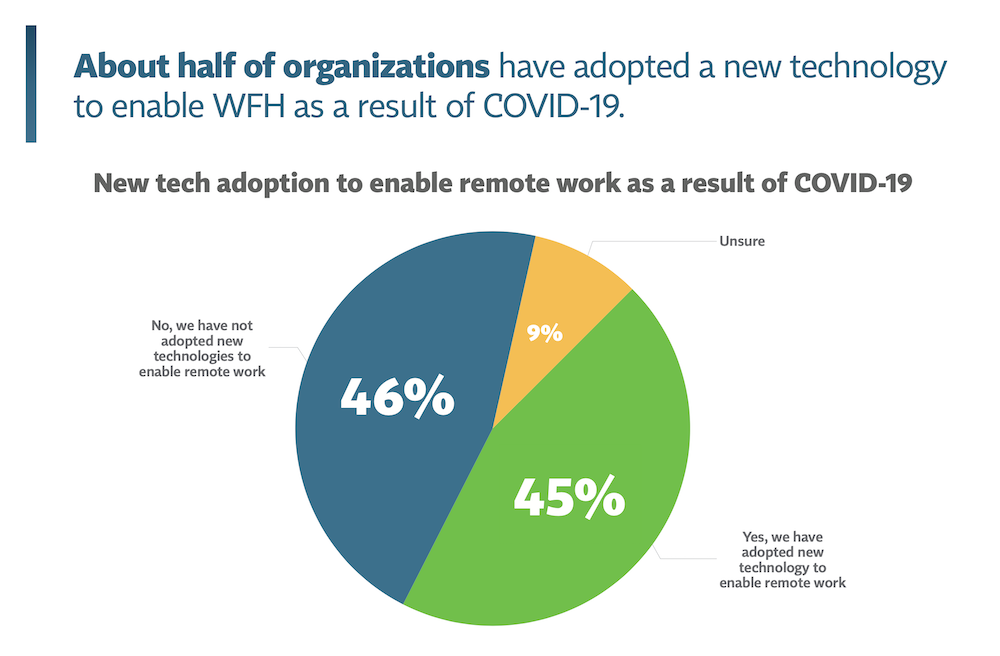 One of the vulnerabilities has to do with the high number of organizations (45%) adopting new technology or contracting with a new vendor to enable remote work due to Covid-19. However, only 40% of small enterprises have implemented a working cybersecurity policy.