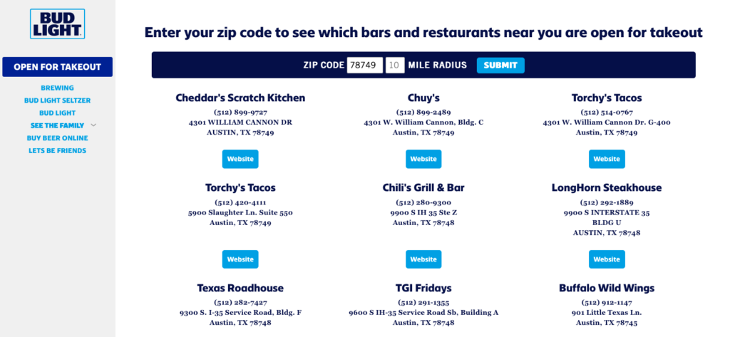 When you visit BudLight.com, you can enter your zip code to see participating restaurants in your area.
