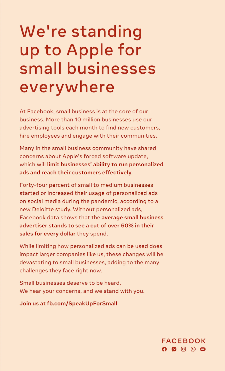 According to Facebook, “Apple announced product and policy changes that will impact data sharing across iOS. The policy and the limits it places on advertising will harm the growth of businesses and the free internet.”