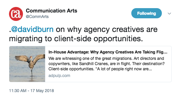 Communication Arts is "The Bible" for the creative side of the business. To be featured in the advertising or design annual, or to appear in a feature article in one of the quarterly editions, is a form of acceptance into the club. To have an Adpulp article land on CA's digital front page this week is not quite the same level of recognition, but it's handsome recognition and I am grateful. CA also used their …