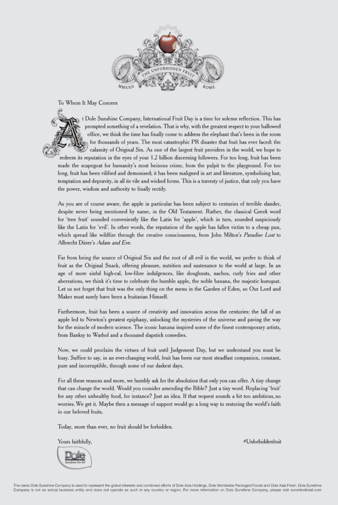 Given the circumstances, I duly appreciate Dole Sunshine Company’s letter to His Holiness, Pope Francis. The letter seeks to restore the good name of ‘forbidden fruit’ after thousands of years of slander.