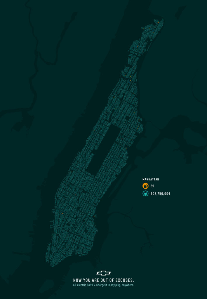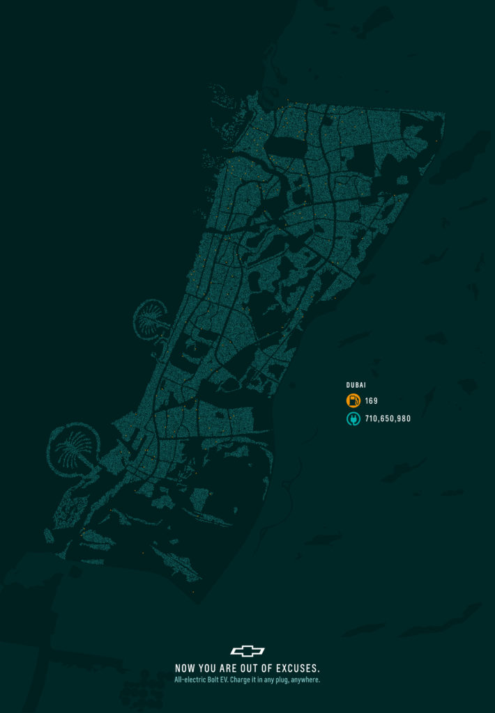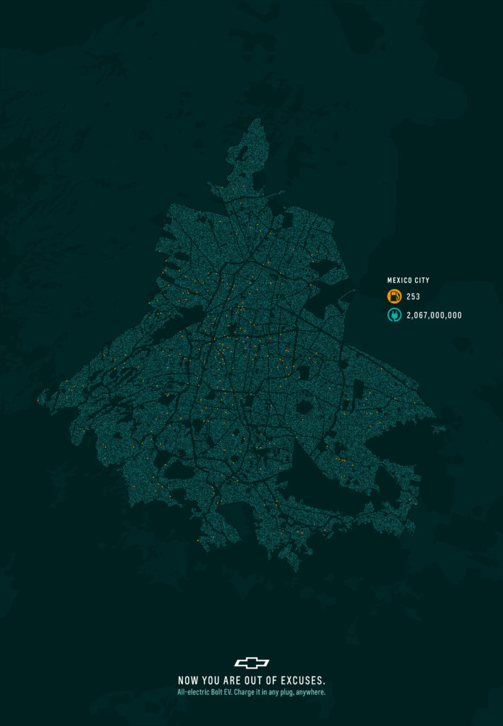In this new campaign from McCann Worldgroup México and Chevrolet, this key selling point is made graphically, by comparing the number of gas stations in a city to the number of electrical outlets.